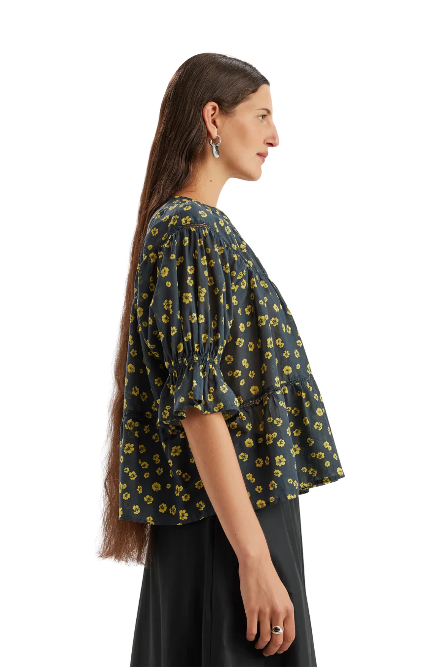 Cotton voile top featuring a lemon floral print with tiered yoke construction and elbow-length ruffled sleeves. A keyhole back detail completes the refined silhouette.